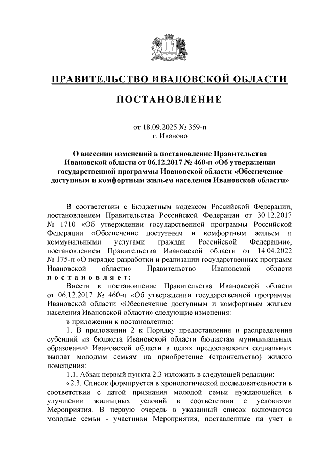 Постановление Правительства Ивановской области от 18.09.2025 N 359-п "О внесении изменений в постановление Правительства Ивановской области от 06.12.2017 N 460-п "Об утверждении государственной программы Ивановской области "Обеспечение доступным и комфортным жильем населения Ивановской области" (вместе с "Порядком предоставления и распределения субсидий бюджетам муниципальных образований Ивановской области на реализацию проектов комплексного развития территорий")