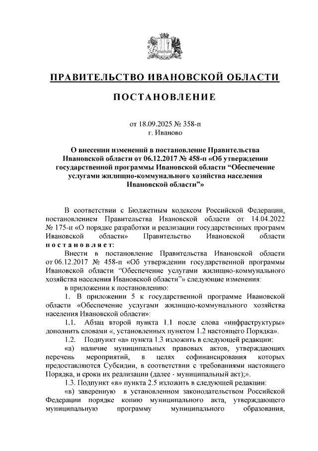 Постановление Правительства Ивановской области от 18.09.2025 N 358-п "О внесении изменений в постановление Правительства Ивановской области от 06.12.2017 N 458-п "Об утверждении государственной программы Ивановской области "Обеспечение услугами жилищно-коммунального хозяйства населения Ивановской области" (вместе с "Порядком предоставления и распределения субсидии бюджету городского округа Кинешма на строительство централизованной системы водоотведения г. Кинешма")