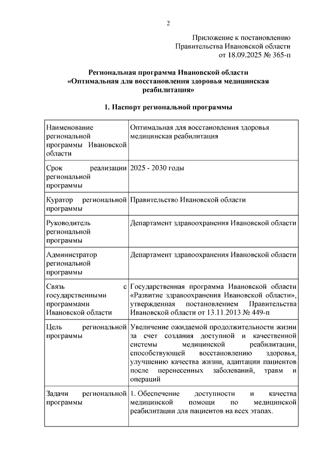 Постановление Правительства Ивановской области от 18.09.2025 N 365-п "Об утверждении региональной программы Ивановской области "Оптимальная для восстановления здоровья медицинская реабилитация"