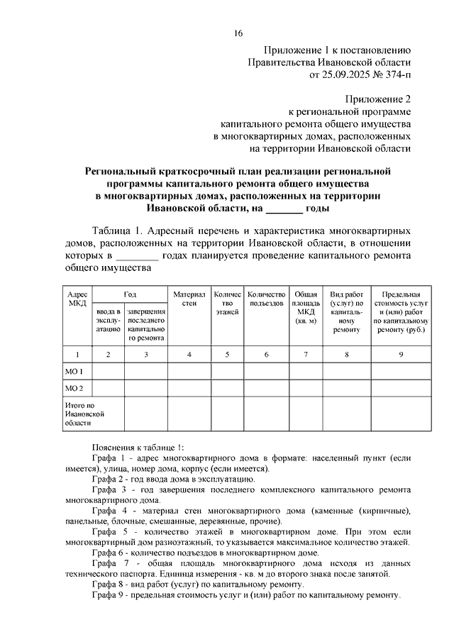 Постановление Правительства Ивановской области от 25.09.2025 N 374-п "О внесении изменений в постановление Правительства Ивановской области от 30.04.2014 N 164-п "Об утверждении региональной программы капитального ремонта общего имущества в многоквартирных домах, расположенных на территории Ивановской области" (вместе с "Перечнем многоквартирных домов, в которых ремонт, замена, модернизация лифтов, ремонт лифтовых шахт, машинных и блочных помещений в многоквартирных домах предусмотрены в приоритетном порядке")