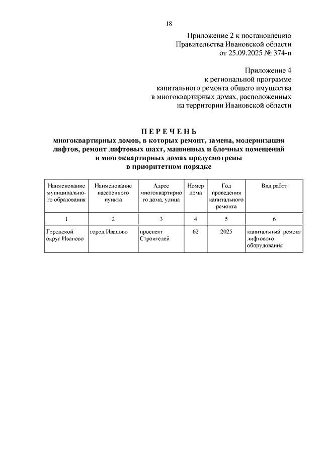 Постановление Правительства Ивановской области от 25.09.2025 N 374-п "О внесении изменений в постановление Правительства Ивановской области от 30.04.2014 N 164-п "Об утверждении региональной программы капитального ремонта общего имущества в многоквартирных домах, расположенных на территории Ивановской области" (вместе с "Перечнем многоквартирных домов, в которых ремонт, замена, модернизация лифтов, ремонт лифтовых шахт, машинных и блочных помещений в многоквартирных домах предусмотрены в приоритетном порядке")