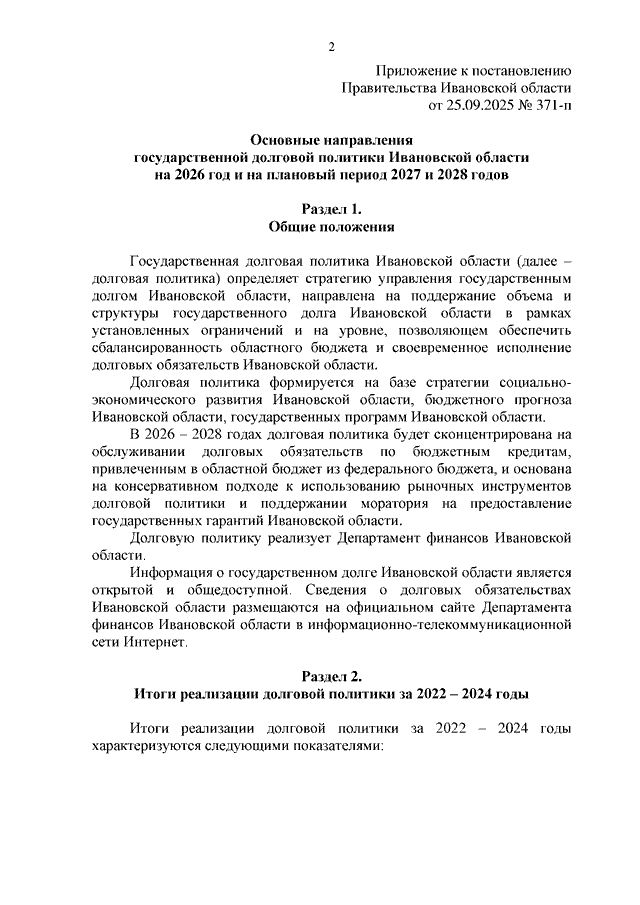 Постановление Правительства Ивановской области от 25.09.2025 N 371-п "Об утверждении основных направлений государственной долговой политики Ивановской области на 2026 год и на плановый период 2027 и 2028 годов"