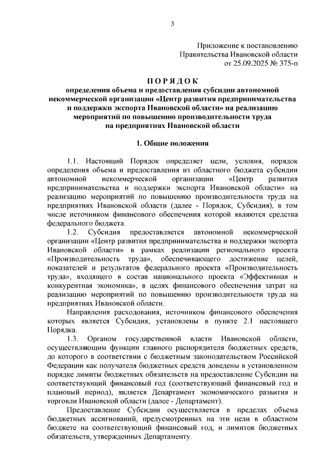 Постановление Правительства Ивановской области от 25.09.2025 N 375-п "Об утверждении Порядка определения объема и предоставления субсидии автономной некоммерческой организации "Центр развития предпринимательства и поддержки экспорта Ивановской области" на реализацию мероприятий по повышению производительности труда на предприятиях Ивановской области и о признании утратившими силу некоторых постановлений Правительства Ивановской области"