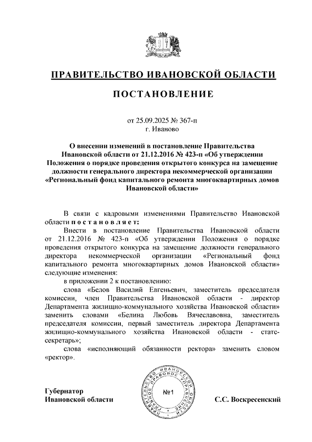 Постановление Правительства Ивановской области от 25.09.2025 N 367-п "О внесении изменений в постановление Правительства Ивановской области от 21.12.2016 N 423-п "Об утверждении Положения о порядке проведения открытого конкурса на замещение должности генерального директора некоммерческой организации "Региональный фонд капитального ремонта многоквартирных домов Ивановской области"