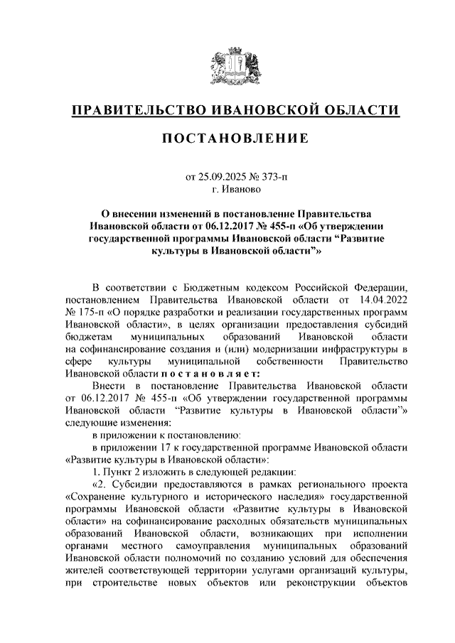 Постановление Правительства Ивановской области от 25.09.2025 N 373-п "О внесении изменений в постановление Правительства Ивановской области от 06.12.2017 N 455-п "Об утверждении государственной программы Ивановской области "Развитие культуры в Ивановской области"