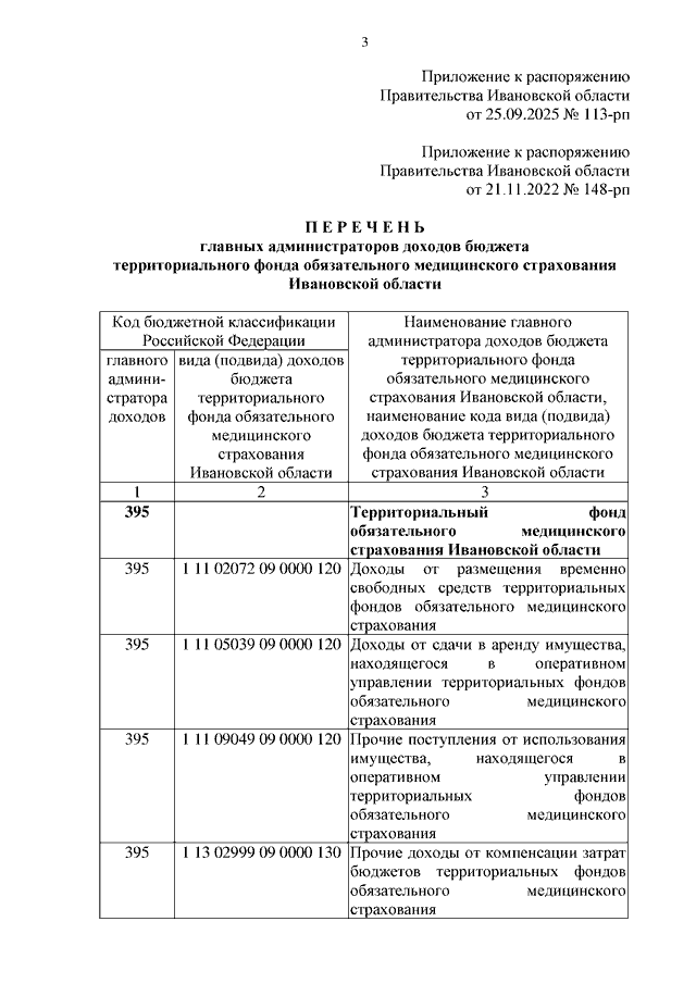 Распоряжение Правительства Ивановской области от 25.09.2025 N 113-рп "О внесении изменения в распоряжение Правительства Ивановской области от 21.11.2022 N 148-рп "Об утверждении перечня главных администраторов доходов бюджета территориального фонда обязательного медицинского страхования Ивановской области"