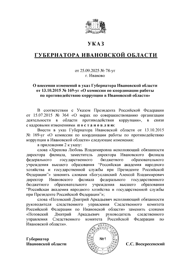 Указ Губернатора Ивановской области от 25.09.2025 N 78-уг "О внесении изменений в указ Губернатора Ивановской области от 13.10.2015 N 169-уг "О комиссии по координации работы по противодействию коррупции в Ивановской области"
