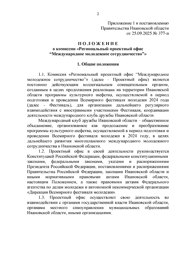 Постановление Правительства Ивановской области от 25.09.2025 N 377-п "О Региональном проектном офисе "Международное молодежное сотрудничество" (вместе с "Положением о комиссии "Региональный проектный офис "Международное молодежное сотрудничество")