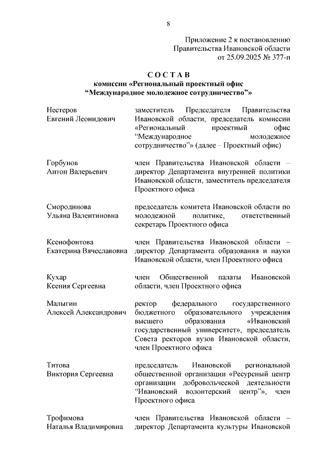 Постановление Правительства Ивановской области от 25.09.2025 N 377-п "О Региональном проектном офисе "Международное молодежное сотрудничество" (вместе с "Положением о комиссии "Региональный проектный офис "Международное молодежное сотрудничество")