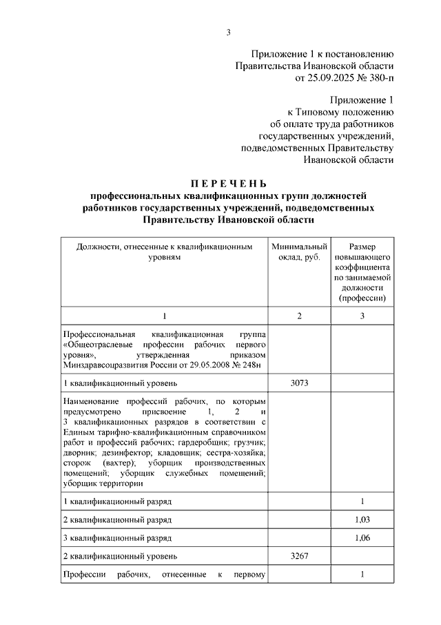 Постановление Правительства Ивановской области от 25.09.2025 N 380-п "О внесении изменений в постановление Правительства Ивановской области от 31.12.2008 N 372-п "О системе оплаты труда работников государственных учреждений, подведомственных Правительству Ивановской области" (вместе с "Перечнем профессиональных квалификационных групп должностей работников государственных учреждений, подведомственных Правительству Ивановской области")