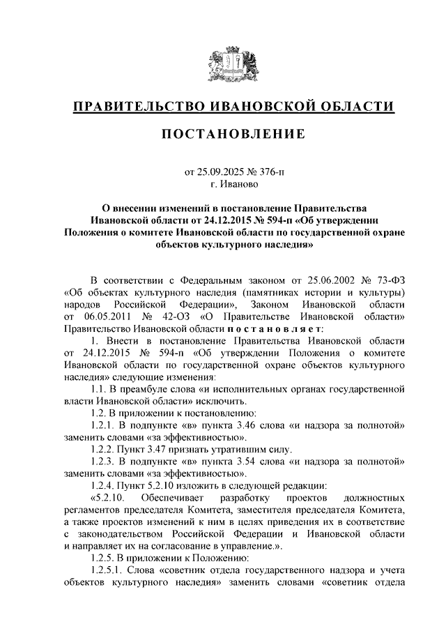 Постановление Правительства Ивановской области от 25.09.2025 N 376-п "О внесении изменений в постановление Правительства Ивановской области от 24.12.2015 N 594-п "Об утверждении Положения о комитете Ивановской области по государственной охране объектов культурного наследия"