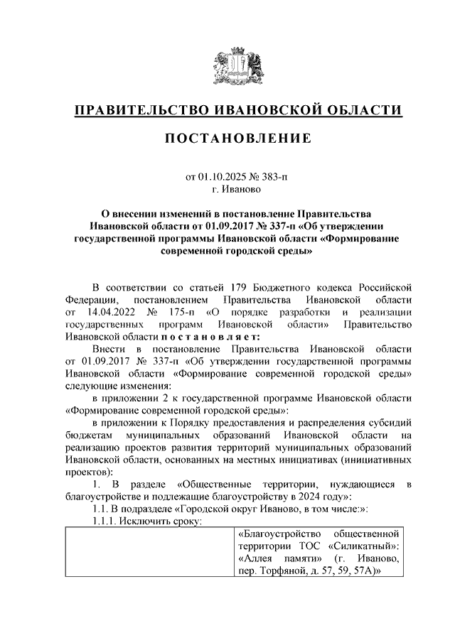 Постановление Правительства Ивановской области от 01.10.2025 N 383-п "О внесении изменений в постановление Правительства Ивановской области от 01.09.2017 N 337-п "Об утверждении государственной программы Ивановской области "Формирование современной городской среды"