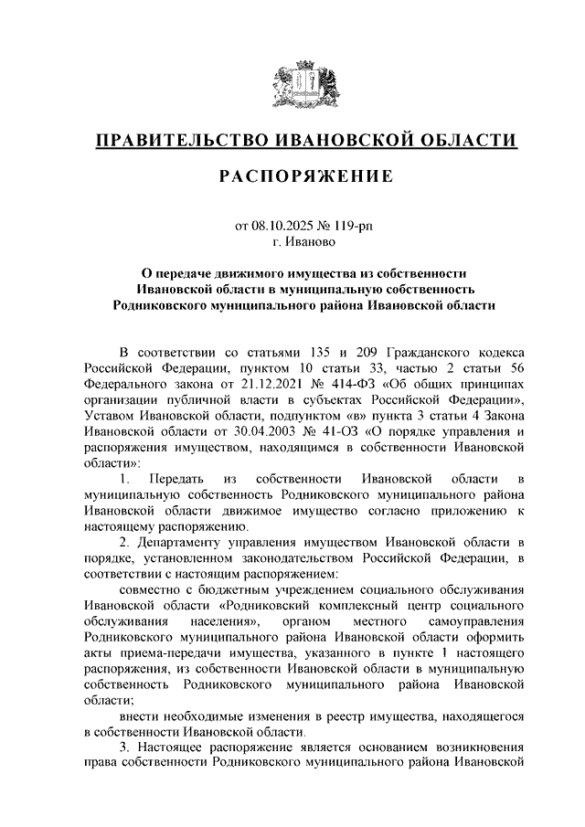 Распоряжение Правительства Ивановской области от 08.10.2025 N 119-рп "О передаче движимого имущества из собственности Ивановской области в муниципальную собственность Родниковского муниципального района Ивановской области"