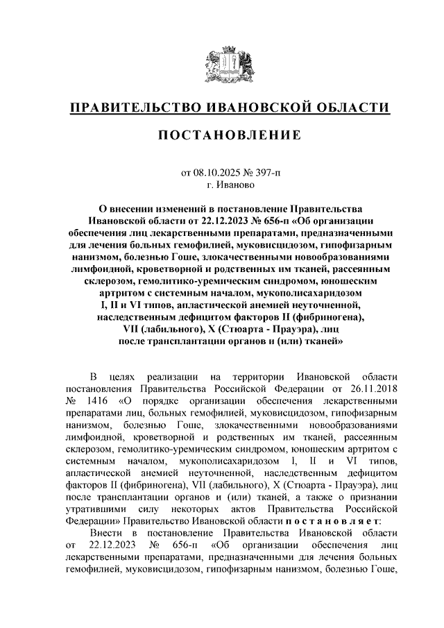 Постановление Правительства Ивановской области от 08.10.2025 N 397-п "О внесении изменений в постановление Правительства Ивановской области от 22.12.2023 N 656-п "Об организации обеспечения лиц лекарственными препаратами, предназначенными для лечения больных гемофилией, муковисцидозом, гипофизарным нанизмом, болезнью Гоше, злокачественными новообразованиями лимфоидной, кроветворной и родственных им тканей, рассеянным склерозом, гемолитико-уремическим синдромом, юношеским артритом с системным началом, мукополисахаридозом I, II и VI типов, апластической анемией неуточненной, наследственным дефицитом факторов II (фибриногена), VII (лабильного), X (Стюарта - Прауэра), лиц после трансплантации органов и (или) тканей"