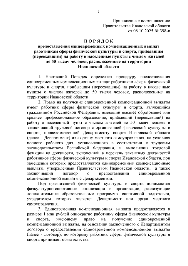 Постановление Правительства Ивановской области от 08.10.2025 N 398-п "О единовременных компенсационных выплатах работникам сферы физической культуры и спорта Ивановской области" (вместе с "Порядком предоставления единовременных компенсационных выплат работникам сферы физической культуры и спорта, прибывшим (переехавшим) на работу в населенные пункты с числом жителей до 50 тысяч человек, расположенные на территории Ивановской области")