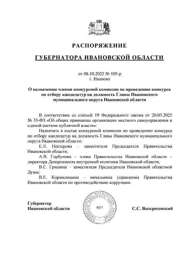 Распоряжение Губернатора Ивановской области от 08.10.2025 N 105-р "О назначении членов конкурсной комиссии по проведению конкурса по отбору кандидатур на должность Главы Ивановского муниципального округа Ивановской области"