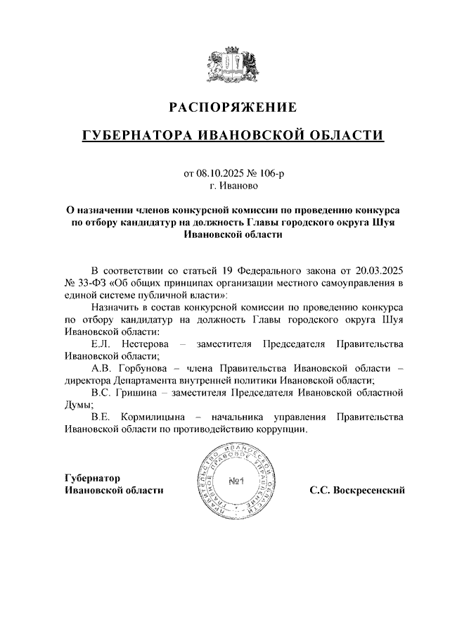 Распоряжение Губернатора Ивановской области от 08.10.2025 N 106-р "О назначении членов конкурсной комиссии по проведению конкурса по отбору кандидатур на должность Главы городского округа Шуя Ивановской области"