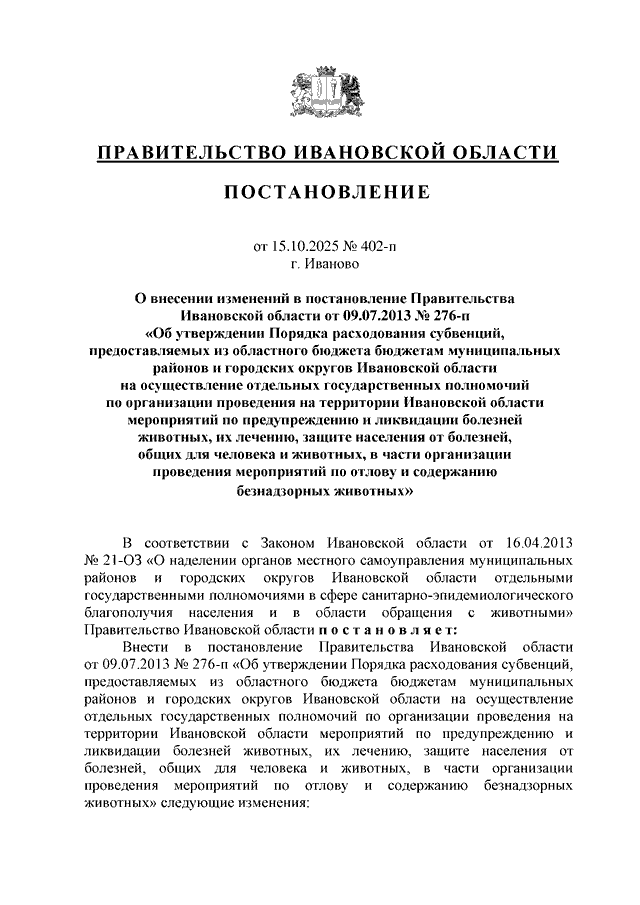 Постановление Правительства Ивановской области от 15.10.2025 N 402-п "О внесении изменений в постановление Правительства Ивановской области от 09.07.2013 N 276-п "Об утверждении Порядка расходования субвенций, предоставляемых из областного бюджета бюджетам муниципальных районов и городских округов Ивановской области на осуществление отдельных государственных полномочий по организации проведения на территории Ивановской области мероприятий по предупреждению и ликвидации болезней животных, их лечению, защите населения от болезней, общих для человека и животных, в части организации проведения мероприятий по отлову и содержанию безнадзорных животных"