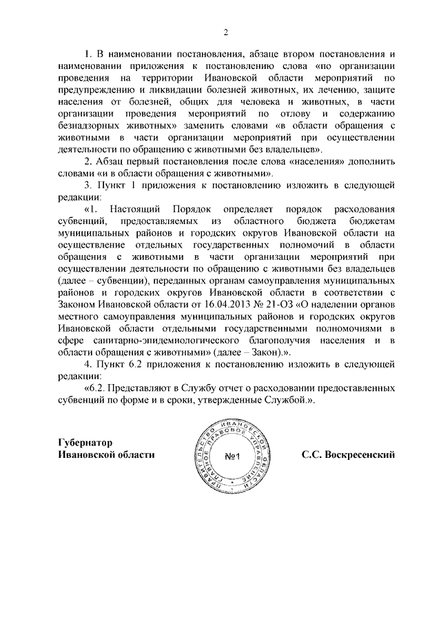 Постановление Правительства Ивановской области от 15.10.2025 N 402-п "О внесении изменений в постановление Правительства Ивановской области от 09.07.2013 N 276-п "Об утверждении Порядка расходования субвенций, предоставляемых из областного бюджета бюджетам муниципальных районов и городских округов Ивановской области на осуществление отдельных государственных полномочий по организации проведения на территории Ивановской области мероприятий по предупреждению и ликвидации болезней животных, их лечению, защите населения от болезней, общих для человека и животных, в части организации проведения мероприятий по отлову и содержанию безнадзорных животных"