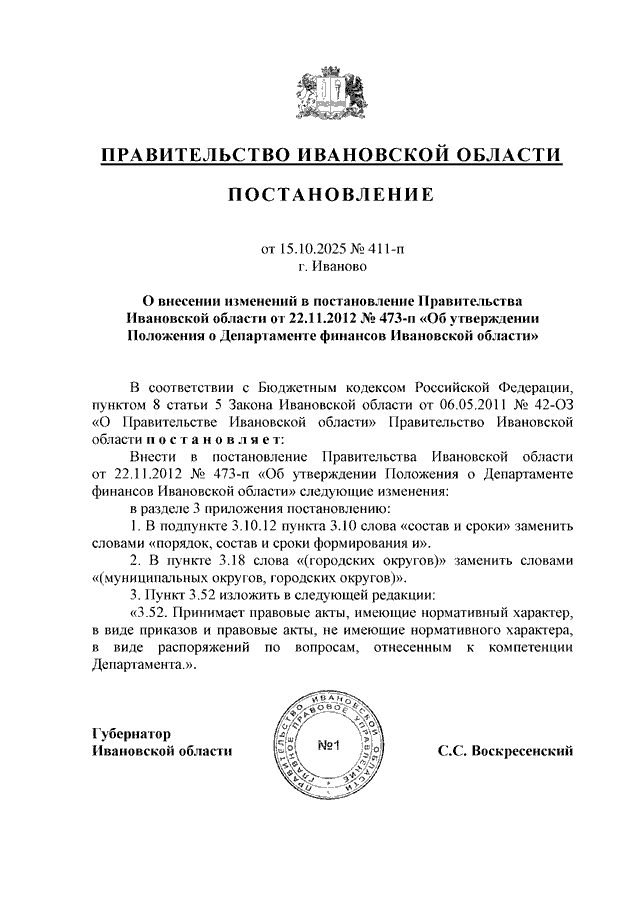 Постановление Правительства Ивановской области от 15.10.2025 N 411-п "О внесении изменений в постановление Правительства Ивановской области от 22.11.2012 N 473-п "Об утверждении Положения о Департаменте финансов Ивановской области"