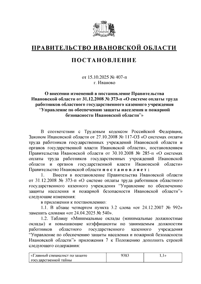Постановление Правительства Ивановской области от 15.10.2025 N 407-п "О внесении изменений в постановление Правительства Ивановской области от 31.12.2008 N 373-п "О системе оплаты труда работников областного государственного казенного учреждения "Управление по обеспечению защиты населения и пожарной безопасности Ивановской области"