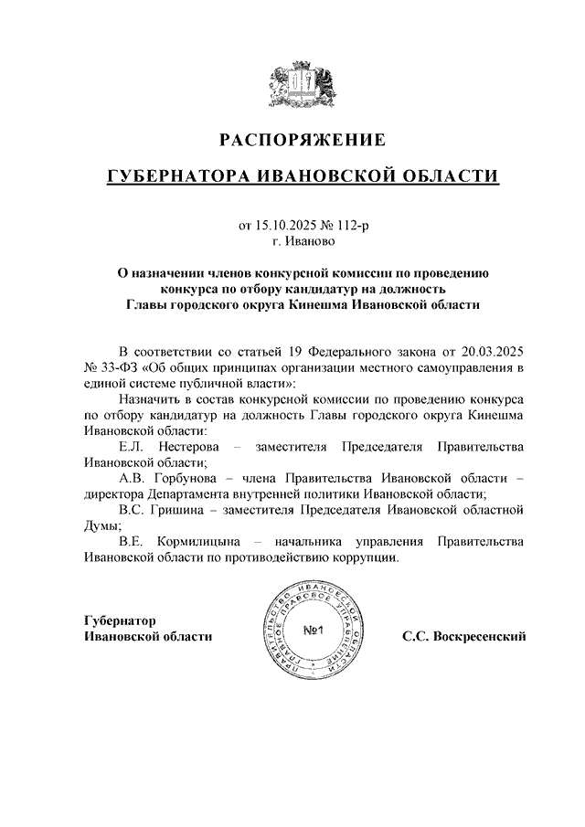 Распоряжение Губернатора Ивановской области от 15.10.2025 N 112-р "О назначении членов конкурсной комиссии по проведению конкурса по отбору кандидатур на должность Главы городского округа Кинешма Ивановской области"