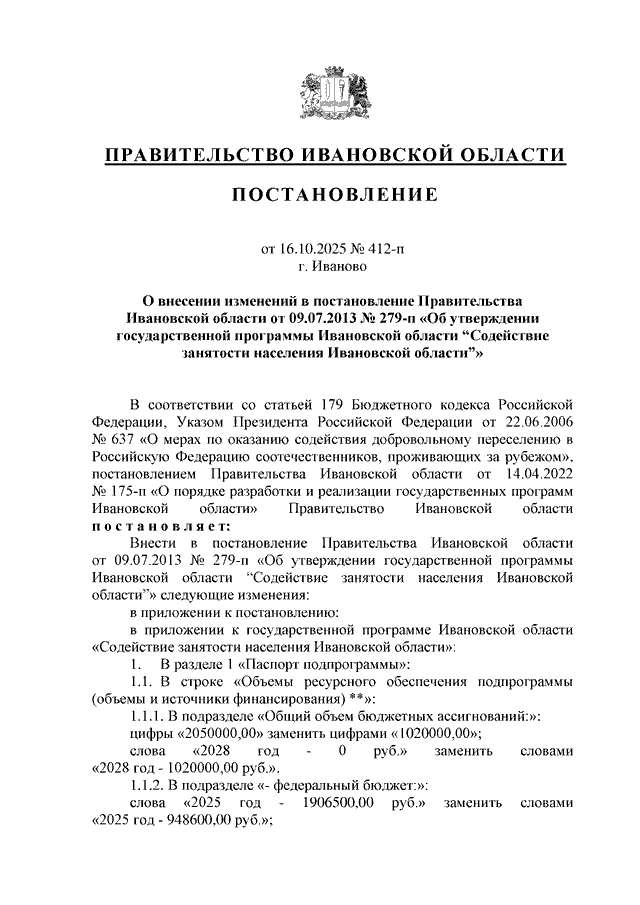 Постановление Правительства Ивановской области от 16.10.2025 N 412-п "О внесении изменений в постановление Правительства Ивановской области от 09.07.2013 N 279-п "Об утверждении государственной программы Ивановской области "Содействие занятости населения Ивановской области"