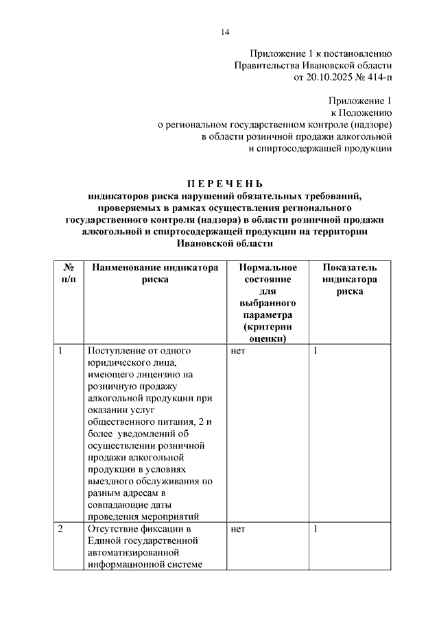 Постановление Правительства Ивановской области от 20.10.2025 N 414-п "О внесении изменений в постановление Правительства Ивановской области от 14.10.2021 N 472-п "Об утверждении Положения о региональном государственном контроле (надзоре) в области розничной продажи алкогольной и спиртосодержащей продукции" (вместе с "Перечнем индикаторов риска нарушений обязательных требований, проверяемых в рамках осуществления регионального государственного контроля (надзора) в области розничной продажи алкогольной и спиртосодержащей продукции на территории Ивановской области")