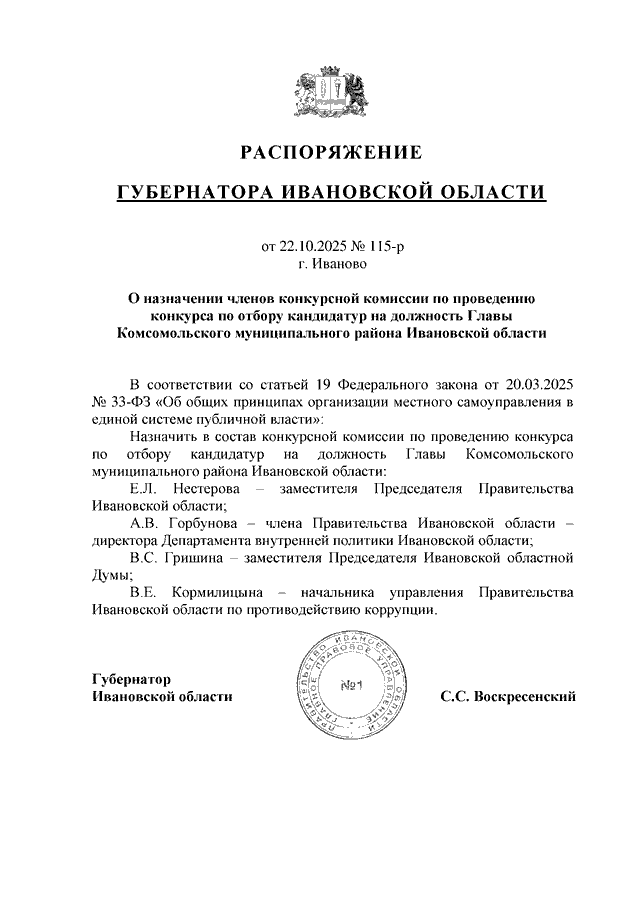 Распоряжение Губернатора Ивановской области от 22.10.2025 N 115-р "О назначении членов конкурсной комиссии по проведению конкурса по отбору кандидатур на должность Главы Комсомольского муниципального района Ивановской области"