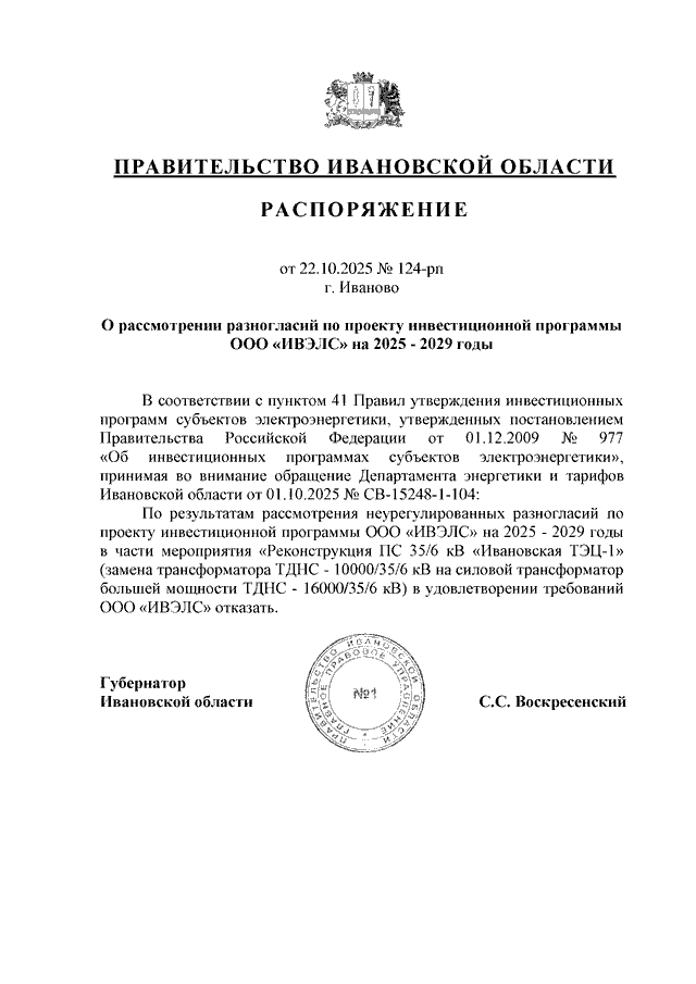 Распоряжение Правительства Ивановской области от 22.10.2025 N 124-рп "О рассмотрении разногласий по проекту инвестиционной программы ООО "ИВЭЛС" на 2025 - 2029 годы"