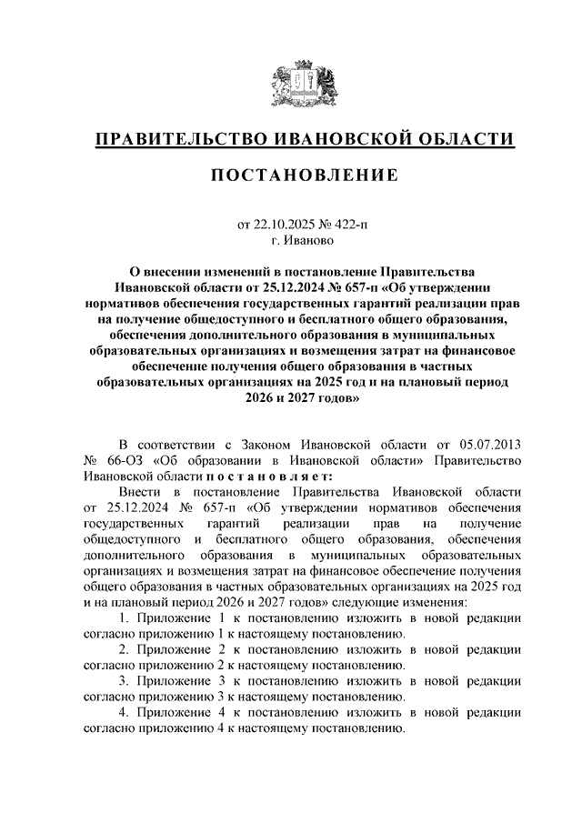 Постановление Правительства Ивановской области от 22.10.2025 N 422-п "О внесении изменений в постановление Правительства Ивановской области от 25.12.2024 N 657-п "Об утверждении нормативов обеспечения государственных гарантий реализации прав на получение общедоступного и бесплатного общего образования, обеспечения дополнительного образования в муниципальных образовательных организациях и возмещения затрат на финансовое обеспечение получения общего образования в частных образовательных организациях на 2025 год и на плановый период 2026 и 2027 годов" (вместе с "Нормативами обеспечения государственных гарантий реализации прав на получение общедоступного и бесплатного дошкольного, начального общего, основного общего, среднего общего образования в муниципальных общеобразовательных организациях, обеспечения дополнительного образования в муниципальных общеобразовательных организациях на 2025 год и на плановый период 2026 и 2027 годов", "Нормативами возмещения затрат на финансовое обеспечение получения дошкольного, начального общего, основного общего, среднего общего образования в частных общеобразовательных организациях, осуществляющих образовательную деятельность по имеющим государственную аккредитацию основным общеобразовательным программам, на 2025 год и на плановый период 2026 и 2027 годов", "Нормативами обеспечения государственных гарантий реализации прав на получение общедоступного и бесплатного дошкольного образования в муниципальных дошкольных образовательных организациях на 2025 год и на плановый период 2026 и 2027 годов", "Нормативами возмещения затрат на финансовое обеспечение получения дошкольного образования в частных дошкольных образовательных организациях на 2025 год и на плановый период 2026 и 2027 годов")