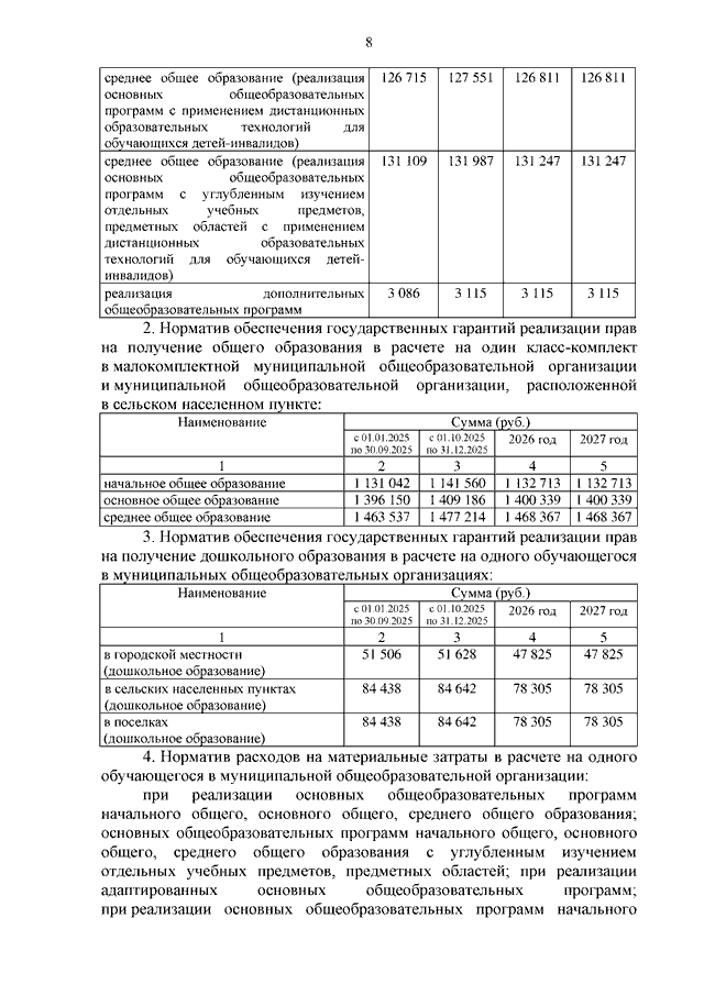 Постановление Правительства Ивановской области от 22.10.2025 N 422-п "О внесении изменений в постановление Правительства Ивановской области от 25.12.2024 N 657-п "Об утверждении нормативов обеспечения государственных гарантий реализации прав на получение общедоступного и бесплатного общего образования, обеспечения дополнительного образования в муниципальных образовательных организациях и возмещения затрат на финансовое обеспечение получения общего образования в частных образовательных организациях на 2025 год и на плановый период 2026 и 2027 годов" (вместе с "Нормативами обеспечения государственных гарантий реализации прав на получение общедоступного и бесплатного дошкольного, начального общего, основного общего, среднего общего образования в муниципальных общеобразовательных организациях, обеспечения дополнительного образования в муниципальных общеобразовательных организациях на 2025 год и на плановый период 2026 и 2027 годов", "Нормативами возмещения затрат на финансовое обеспечение получения дошкольного, начального общего, основного общего, среднего общего образования в частных общеобразовательных организациях, осуществляющих образовательную деятельность по имеющим государственную аккредитацию основным общеобразовательным программам, на 2025 год и на плановый период 2026 и 2027 годов", "Нормативами обеспечения государственных гарантий реализации прав на получение общедоступного и бесплатного дошкольного образования в муниципальных дошкольных образовательных организациях на 2025 год и на плановый период 2026 и 2027 годов", "Нормативами возмещения затрат на финансовое обеспечение получения дошкольного образования в частных дошкольных образовательных организациях на 2025 год и на плановый период 2026 и 2027 годов")