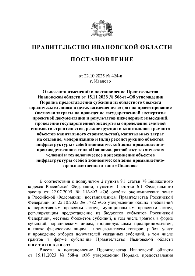 Постановление Правительства Ивановской области от 22.10.2025 N 424-п "О внесении изменений в постановление Правительства Ивановской области от 15.11.2023 N 568-п "Об утверждении Порядка предоставления субсидии из областного бюджета юридическим лицам в целях возмещения затрат на проектирование (включая затраты на проведение государственной экспертизы проектной документации и результатов инженерных изысканий, проведение государственной экспертизы определения сметной стоимости строительства, реконструкции и капитального ремонта объектов капитального строительства), капитальных затрат на создание, модернизацию и (или) реконструкцию объектов инфраструктуры особой экономической зоны промышленно-производственного типа "Иваново", разработку технических условий и технологическое присоединение объектов инфраструктуры особой экономической зоны промышленно-производственного типа "Иваново"