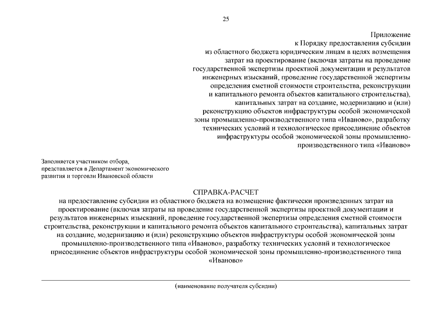 Постановление Правительства Ивановской области от 22.10.2025 N 424-п "О внесении изменений в постановление Правительства Ивановской области от 15.11.2023 N 568-п "Об утверждении Порядка предоставления субсидии из областного бюджета юридическим лицам в целях возмещения затрат на проектирование (включая затраты на проведение государственной экспертизы проектной документации и результатов инженерных изысканий, проведение государственной экспертизы определения сметной стоимости строительства, реконструкции и капитального ремонта объектов капитального строительства), капитальных затрат на создание, модернизацию и (или) реконструкцию объектов инфраструктуры особой экономической зоны промышленно-производственного типа "Иваново", разработку технических условий и технологическое присоединение объектов инфраструктуры особой экономической зоны промышленно-производственного типа "Иваново"