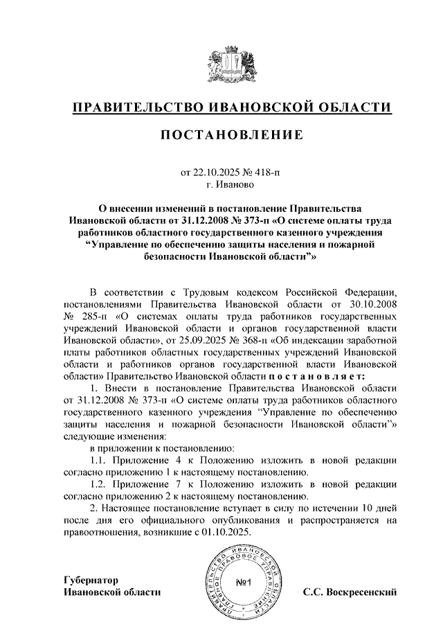 Постановление Правительства Ивановской области от 22.10.2025 N 418-п "О внесении изменений в постановление Правительства Ивановской области от 31.12.2008 N 373-п "О системе оплаты труда работников областного государственного казенного учреждения "Управление по обеспечению защиты населения и пожарной безопасности Ивановской области"