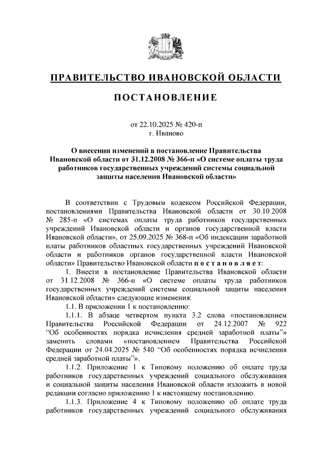 Постановление Правительства Ивановской области от 22.10.2025 N 420-п "О внесении изменений в постановление Правительства Ивановской области от 31.12.2008 N 366-п "О системе оплаты труда работников государственных учреждений системы социальной защиты населения Ивановской области" (вместе с "Перечнем профессиональных квалификационных групп должностей работников государственных учреждений системы социальной защиты населения Ивановской области", "Перечнем профессиональных квалификационных групп должностей работников государственных образовательных учреждений для детей-сирот и детей, оставшихся без попечения родителей, Ивановской области")