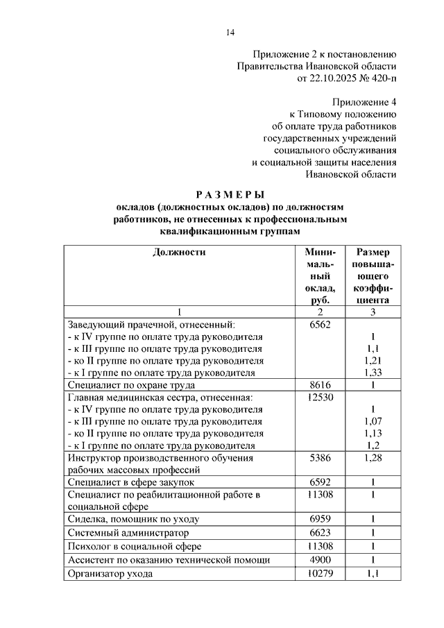 Постановление Правительства Ивановской области от 22.10.2025 N 420-п "О внесении изменений в постановление Правительства Ивановской области от 31.12.2008 N 366-п "О системе оплаты труда работников государственных учреждений системы социальной защиты населения Ивановской области" (вместе с "Перечнем профессиональных квалификационных групп должностей работников государственных учреждений системы социальной защиты населения Ивановской области", "Перечнем профессиональных квалификационных групп должностей работников государственных образовательных учреждений для детей-сирот и детей, оставшихся без попечения родителей, Ивановской области")