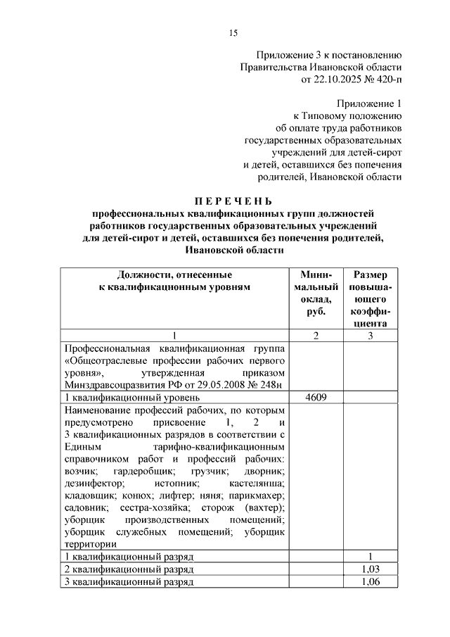 Постановление Правительства Ивановской области от 22.10.2025 N 420-п "О внесении изменений в постановление Правительства Ивановской области от 31.12.2008 N 366-п "О системе оплаты труда работников государственных учреждений системы социальной защиты населения Ивановской области" (вместе с "Перечнем профессиональных квалификационных групп должностей работников государственных учреждений системы социальной защиты населения Ивановской области", "Перечнем профессиональных квалификационных групп должностей работников государственных образовательных учреждений для детей-сирот и детей, оставшихся без попечения родителей, Ивановской области")