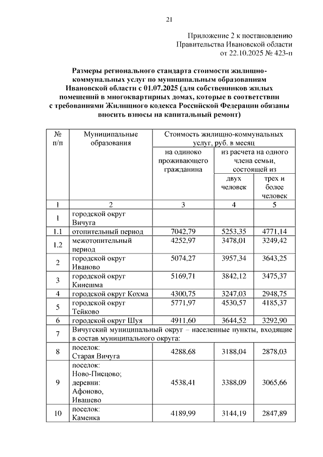 Постановление Правительства Ивановской области от 22.10.2025 N 423-п "Об установлении размеров региональных стандартов стоимости жилищно-коммунальных услуг"