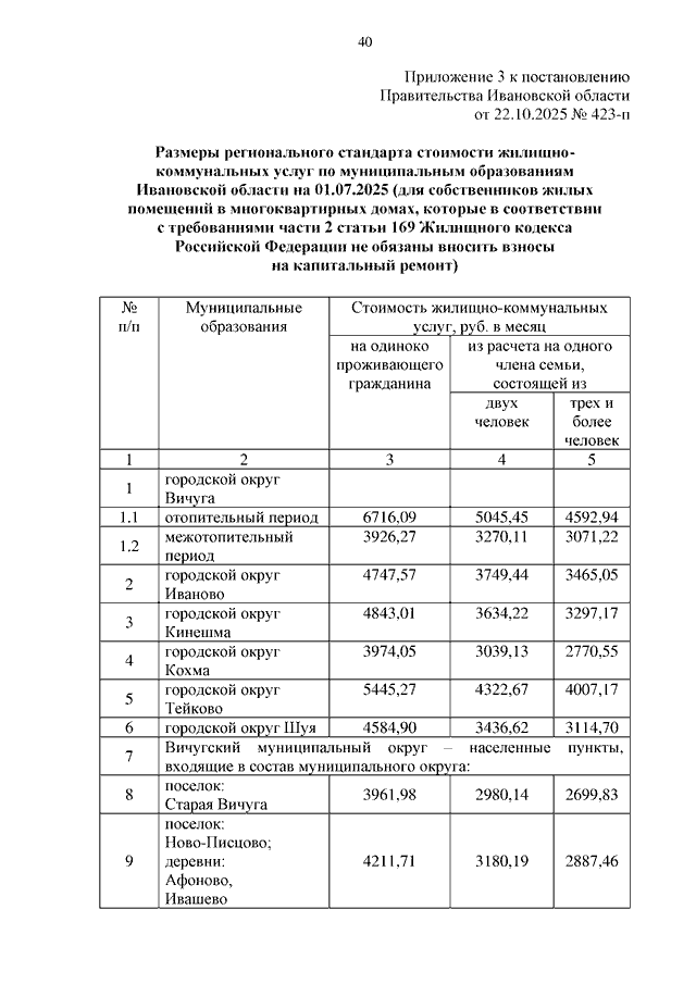 Постановление Правительства Ивановской области от 22.10.2025 N 423-п "Об установлении размеров региональных стандартов стоимости жилищно-коммунальных услуг"