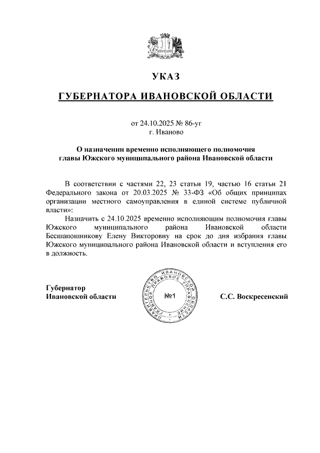 Указ Губернатора Ивановской области от 24.10.2025 N 86-уг "О назначении временно исполняющего полномочия главы Южского муниципального района Ивановской области"