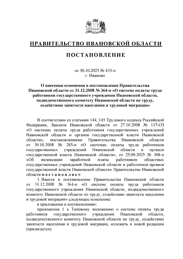 Постановление Правительства Ивановской области от 30.10.2025 N 433-п "О внесении изменения в постановление Правительства Ивановской области от 31.12.2008 N 364-п "О системе оплаты труда работников государственного учреждения Ивановской области, подведомственного комитету Ивановской области по труду, содействию занятости населения и трудовой миграции"
