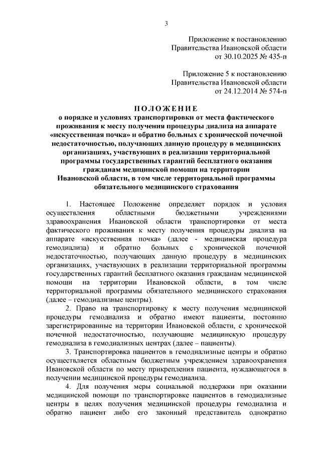 Постановление Правительства Ивановской области от 30.10.2025 N 435-п "О внесении изменений в постановление Правительства Ивановской области от 24.12.2014 N 574-п "О порядке и условиях предоставления мер социальной поддержки отдельным группам населения при оказании медицинской помощи" (вместе с "Положением о порядке и условиях транспортировки от места фактического проживания к месту получения процедуры диализа на аппарате "Искусственная почка" и обратно больных с хронической почечной недостаточностью, получающих данную процедуру в медицинских организациях, участвующих в реализации территориальной программы государственных гарантий бесплатного оказания гражданам медицинской помощи на территории Ивановской области, в том числе территориальной программы обязательного медицинского страхования")