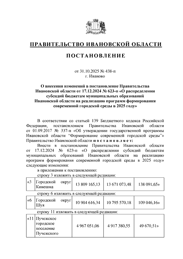 Постановление Правительства Ивановской области от 31.10.2025 N 438-п "О внесении изменений в постановление Правительства Ивановской области от 17.12.2024 N 623-п "О распределении субсидий бюджетам муниципальных образований Ивановской области на реализацию программ формирования современной городской среды в 2025 году"