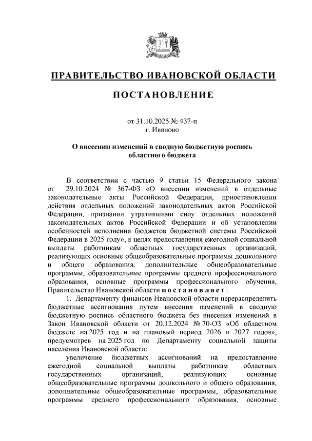 Постановление Правительства Ивановской области от 31.10.2025 N 437-п "О внесении изменений в сводную бюджетную роспись областного бюджета"