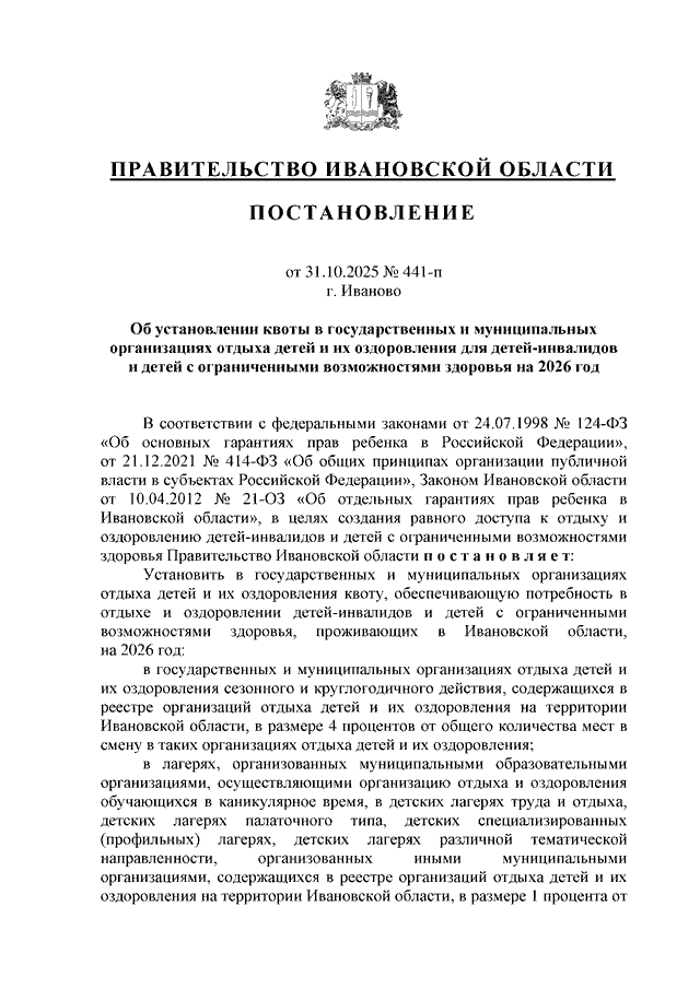 Постановление Правительства Ивановской области от 31.10.2025 N 441-п "Об установлении квоты в государственных и муниципальных организациях отдыха детей и их оздоровления для детей-инвалидов и детей с ограниченными возможностями здоровья на 2026 год"
