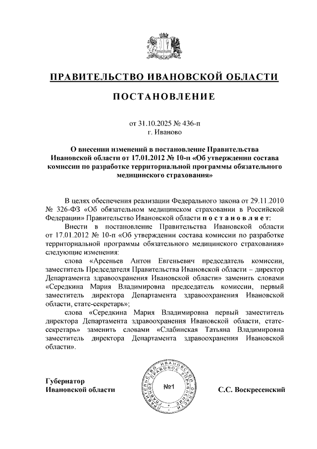 Постановление Правительства Ивановской области от 31.10.2025 N 436-п "О внесении изменений в постановление Правительства Ивановской области от 17.01.2012 N 10-п "Об утверждении состава комиссии по разработке территориальной программы обязательного медицинского страхования"