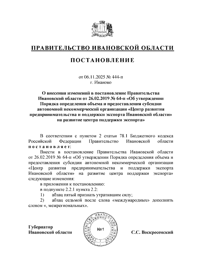 Постановление Правительства Ивановской области от 06.11.2025 N 444-п "О внесении изменений в постановление Правительства Ивановской области от 26.02.2019 N 64-п "Об утверждении Порядка определения объема и предоставления субсидии автономной некоммерческой организации "Центр развития предпринимательства и поддержки экспорта Ивановской области" на развитие центра поддержки экспорта"