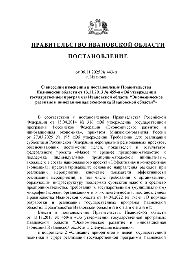 Постановление Правительства Ивановской области от 06.11.2025 N 443-п "О внесении изменений в постановление Правительства Ивановской области от 13.11.2013 N 459-п "Об утверждении государственной программы Ивановской области "Экономическое развитие и инновационная экономика Ивановской области"