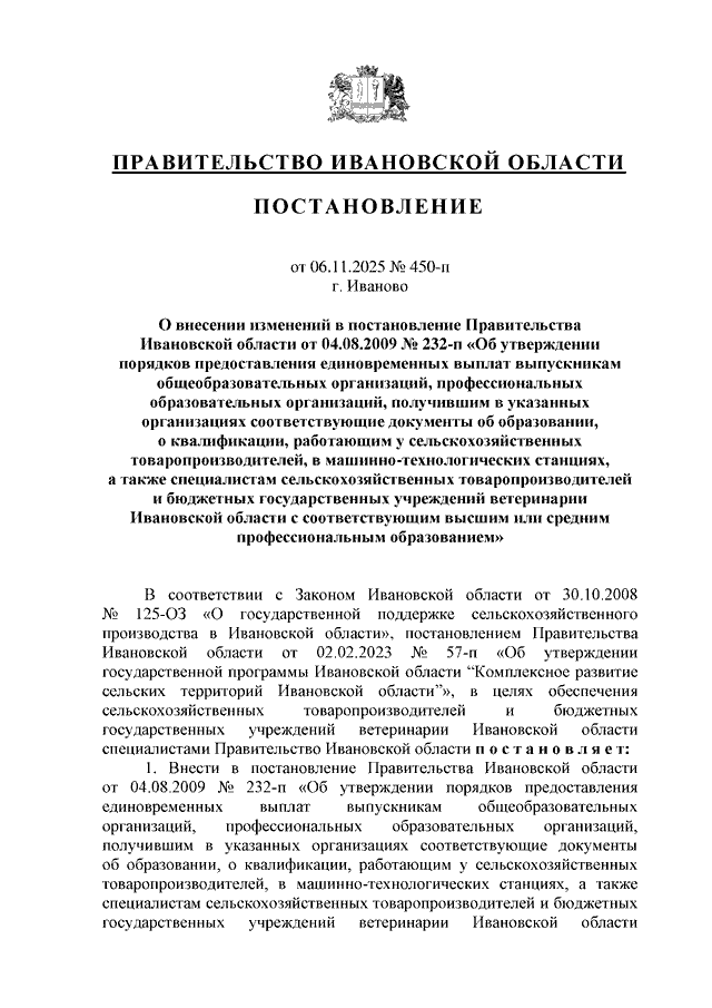 Постановление Правительства Ивановской области от 06.11.2025 N 450-п "О внесении изменений в постановление Правительства Ивановской области от 04.08.2009 N 232-п "Об утверждении порядков предоставления единовременных выплат выпускникам общеобразовательных организаций, профессиональных образовательных организаций, получившим в указанных организациях соответствующие документы об образовании, о квалификации, работающим у сельскохозяйственных товаропроизводителей, в машинно-технологических станциях, а также специалистам сельскохозяйственных товаропроизводителей и бюджетных государственных учреждений ветеринарии Ивановской области с соответствующим высшим или средним профессиональным образованием"